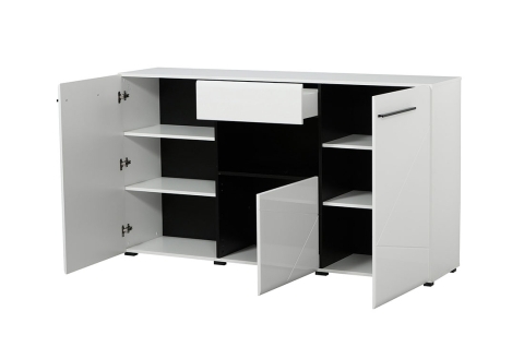 Näyttävä valkoinen senkki runsaalla säilytystilalla. Koko 173x42cm, korkeus 97cm.