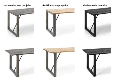 4-hengen ruokailuryhmää saatavana useita värejä (antiikki, harmaa, musta) ja kokoja (140cm, 180cm ja 220cm). Myös lisähintaan mustat tai valkoiset metallijalat. Puujaloissa mustat metallituennat. Tämä lankkupöytäryhmä käy myös katetulle terassille ulkokäyttöön soveliaan pintakäsittelyn vuoksi. Kysy lisää.