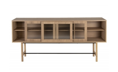 Upea skandinaavisen tyylinen tammen sävyinen liukuovellinen senkki korkeimmilla jaloilla. Koko 210x40cm, korkeus 95 cm.
