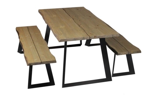 Todella järeästi valmistettu kahdella paksulla massiivipuu lankulla oleva 4-hengen lankku ruokailuryhmä Carson-tuoleilla. Pöytä koko 150x89cm, korkeus noin 75cm. Kysy saatavuus. NYT HUIPPUTARJOUS, RAJOITETTU ERÄ!