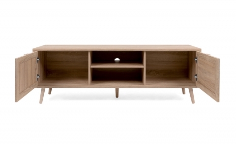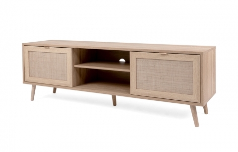 Todella näyttävä viilu-rottinkityyppinen puunvärinen tv-taso korkeilla jaloilla. Koko 150x40cm, korkeus 52cm.