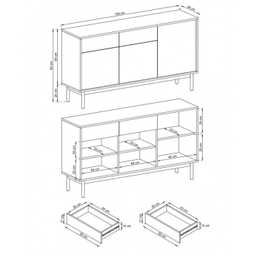 Tammen värinen 18 mm laminoitu kalustelevyrunko, harmaat etusarjat. ABS-reunanauha. Mustat maalatut puujalat (K20 cm). Kaksi vetolaatikkoa ja kolme kaappia. Kaappien sisällä välihyllyt. Ovissa ja laatikoissa push- to-open-mekanismi.