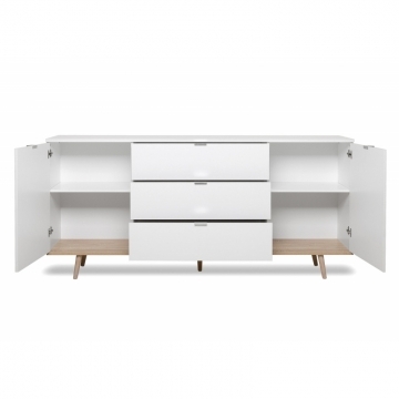 Upea, tyyliltään skandinaavinen Göteborg senkki valko-tammen värillä. Koko 180x85cm, syvyys 40cm.
